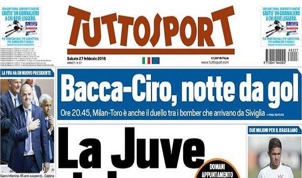 Sul quotidiano sportivo piemontese, in risalto ovviamente l’elezione a Presidente della FIFA di Gianni Infantino e tanta Juventus.