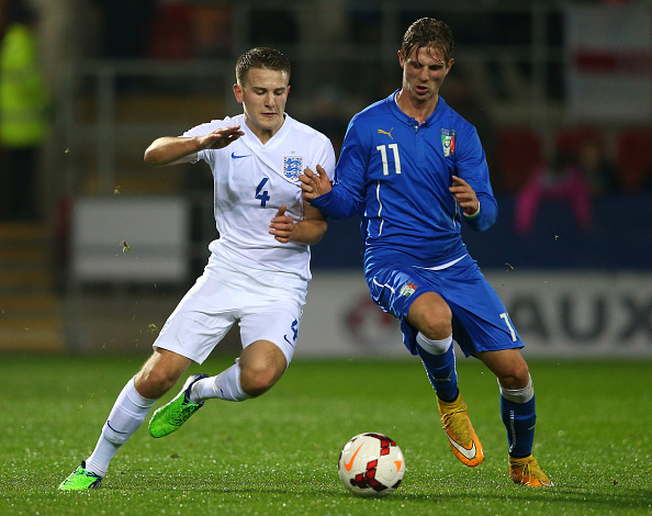 ROTHERHAM, ENGLAND - NOVEMBER 14: Bryn Morris of England U19 and Luca Vido of Italy U19 challenge for the ball during the International friendly match between England U19 and Italy U19 at The New York Stadium on November 14, 2014 in Rotherham, England. (Photo by Alex Livesey/Getty Images)
