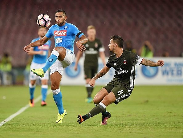 NAPLES, ITALY - AUGUST 27: Napoli's player Faouzi Ghoulam vies with AC Milan player Suso during the Serie A match between SSC Napoli and AC Milan at Stadio San Paolo on August 27, 2016 in Naples, Italy. (Photo by Francesco Pecoraro/Getty Images)