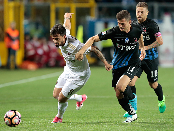 BERGAMO, ITALY - MAY 13: Suso of AC Milan (L) competes for the ball with Remo Freuler of Atalanta BC during the Serie A match between Atalanta BC and AC Milan at Stadio Atleti Azzurri d'Italia on May 13, 2017 in Bergamo, Italy. (Photo by Emilio Andreoli/Getty Images)