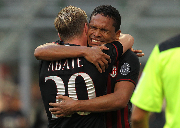 MILAN, ITALY - AUGUST 21: Carlos Bacca (R) of AC Milan celebrates with his team-mate Ignazio Abate (L) after scoring the opening goal during the Serie A match between AC Milan and FC Torino at Stadio Giuseppe Meazza on August 21, 2016 in Milan, Italy. (Photo by Marco Luzzani/Getty Images)