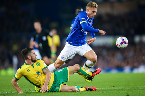 LIVERPOOL, ENGLAND - SEPTEMBER 20: Robbie Brady of Norwich City tackles Gerard Deulofeu of Everton during the EFL Cup match between Everton and Norwich City at Goodison Park on September 20, 2016 in Liverpool, England. (Photo by Robbie Jay Barratt - AMA/Getty Images)