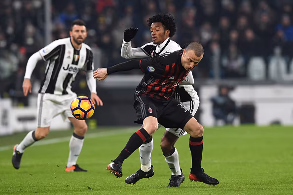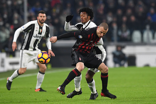 TURIN, ITALY - JANUARY 25: Juan Cuadrado (L) of Juventus FC competes with Luca Antonelli of AC Milan during the TIM Cup match between Juventus FC and AC Milan at Juventus Stadium on January 25, 2017 in Turin, Italy. (Photo by Valerio Pennicino/Getty Images)