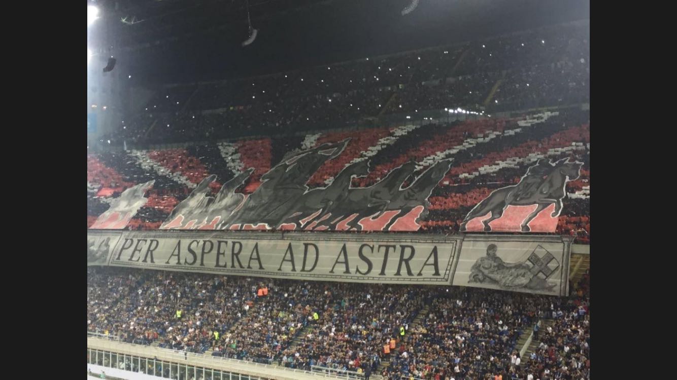 La curva sud, lato rossonero dello stadio, espone una gigantografia della citazione di Cicerone “Per aspera ad astra”, tradotta “attraverso le asperità sino alle stelle”, per caricare il Milan a superare le avversità.