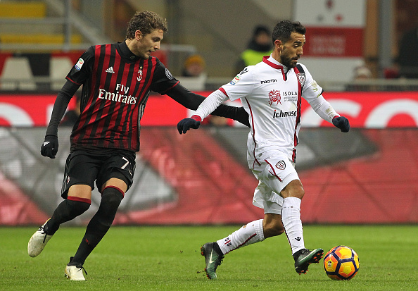 MILAN, ITALY - JANUARY 08: Marco Sau (R) of Cagliari Calcio competes for the ball with Manuel Locatelli (L) of AC Milan during the Serie A match between AC Milan and Cagliari Calcio at Stadio Giuseppe Meazza on January 8, 2017 in Milan, Italy. (Photo by Marco Luzzani/Getty Images)
