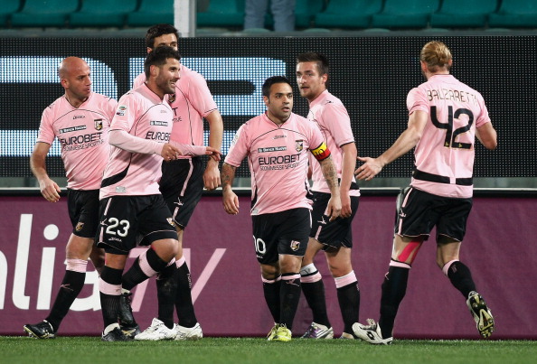 PALERMO, ITALY - FEBRUARY 02: Fabrizio Miccoli (C) of Palermo celebrates with team-mates after scoring the opening goal of the Serie A match between US Citta di Palermo and Juventus FC at Stadio Renzo Barbera on February 2, 2011 in Palermo, Italy. (Photo by Maurizio Lagana/Getty Images)