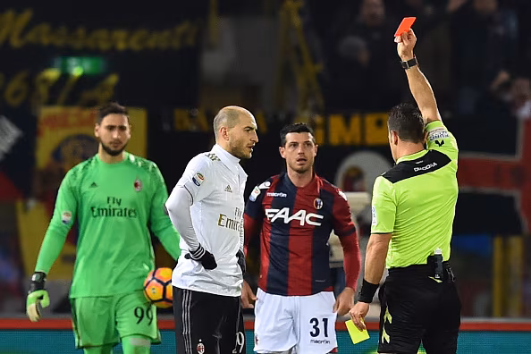 AC Milan's defender from Italy Gabriel Paletta (2L) is shown a red card by Italian referee Daniele Doveri during the Italian Serie A football match Bologna vs AC Milan at the Stadio Renato Dall'Ara stadium in Bologna on February 8, 2017. / AFP / GIUSEPPE CACACE (Photo credit should read GIUSEPPE CACACE/AFP/Getty Images)