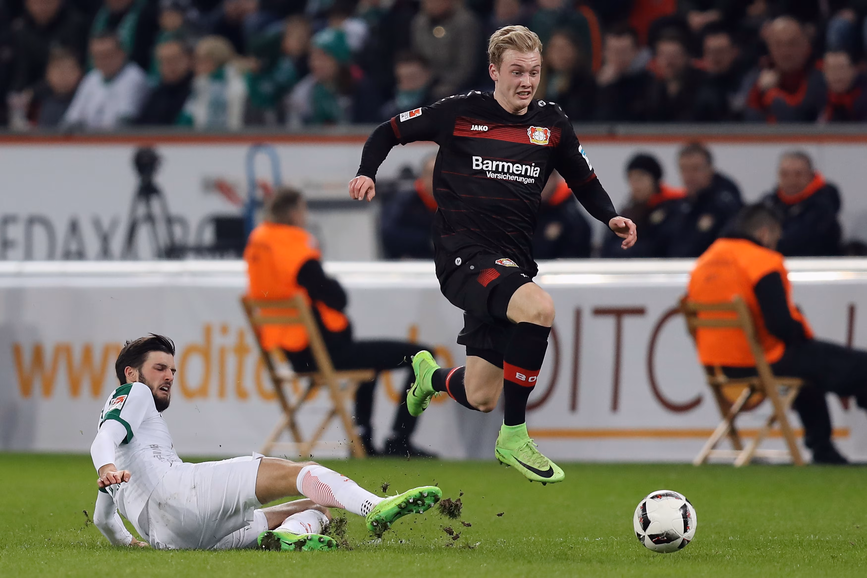 LEVERKUSEN, GERMANY - MARCH 10: Julian Brandt of Leverkusen eludes Florian Grillitsch of Bremen during the Bundesliga match between Bayer 04 Leverkusen and Werder Bremen at BayArena on March 10, 2017 in Leverkusen, Germany. (Photo by Maja Hitij/Bongarts/Getty Images)
