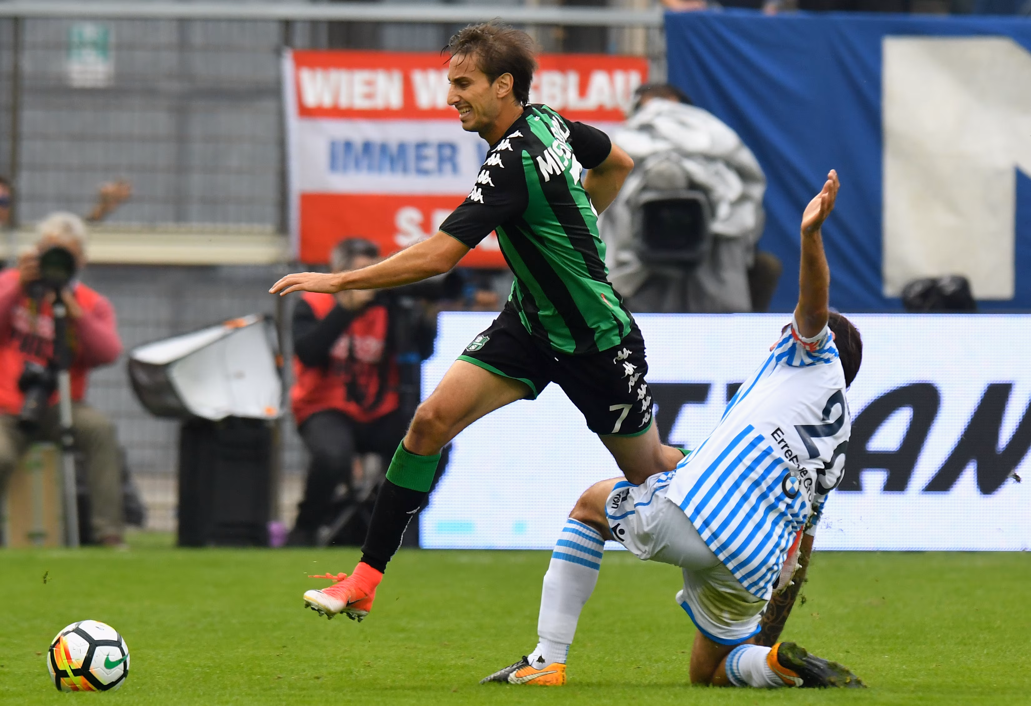 FERRARA, ITALY - OCTOBER 22: Simone Missiroli of US Sassuolo competes for the ball whit Luca Mora of Spal during the Serie A match betweenSpal and US Sassuolo at Stadio Paolo Mazza on October 22, 2017 in Ferrara, Italy. (Photo by Alessandro Sabattini/Getty Images)