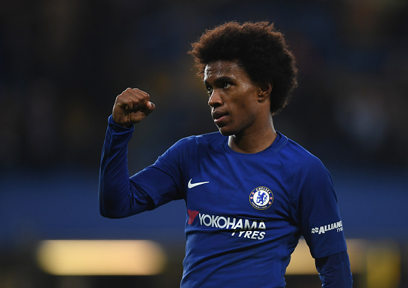 LONDON, ENGLAND - OCTOBER 25: Willian of Chelsea celebrates after scoring the second goal during the Carabao Cup Fourth Round match between Chelsea and Everton at Stamford Bridge on October 25, 2017 in London, England. (Photo by Shaun Botterill/Getty Images)