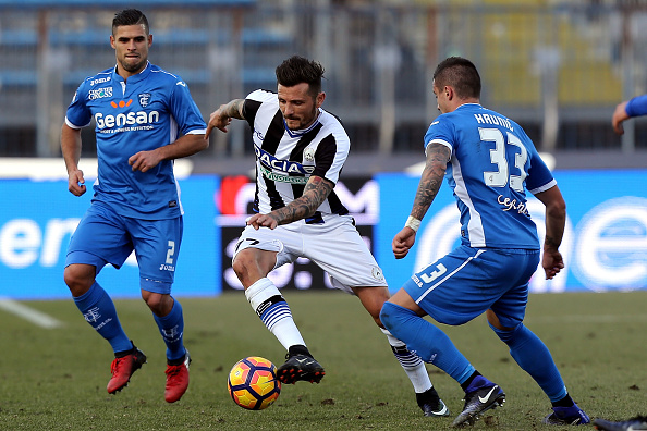 EMPOLI, ITALY - JANUARY 22: Rade Krunic of Empoli FC battles for the ball with Cyril Thereau of Udinese Calcio during the Serie A match between Empoli FC and Udinese Calcio at Stadio Carlo Castellani on January 22, 2017 in Empoli, Italy. (Photo by Gabriele Maltinti/Getty Images)