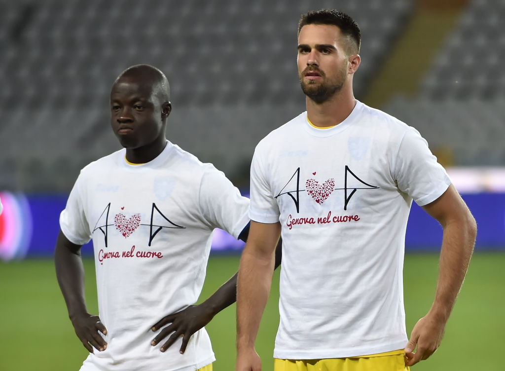 TURIN, ITALY - AUGUST 26: Raman Chisbah and Luka Krajnc of Frosinone Calcio wear a commemorative t-shirt for the victims of Genoa's Morandi Bridge collapse prior to the serie A match between Frosinone Calcio and Bologna FC at Olimpico Stadium on August 26, 2018 in Turin, Italy. (Photo by Giorgio Perottino/Getty Images)