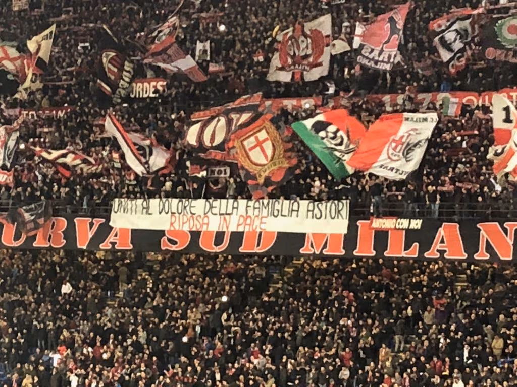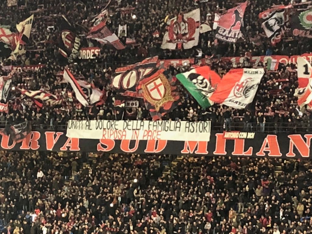 MILANO – Il cuore caldo del tifo rossonero espone uno striscione per Astori in occasione di Milan – Arsenal: “Uniti al dolore della famiglia Astori: riposa in pace”.