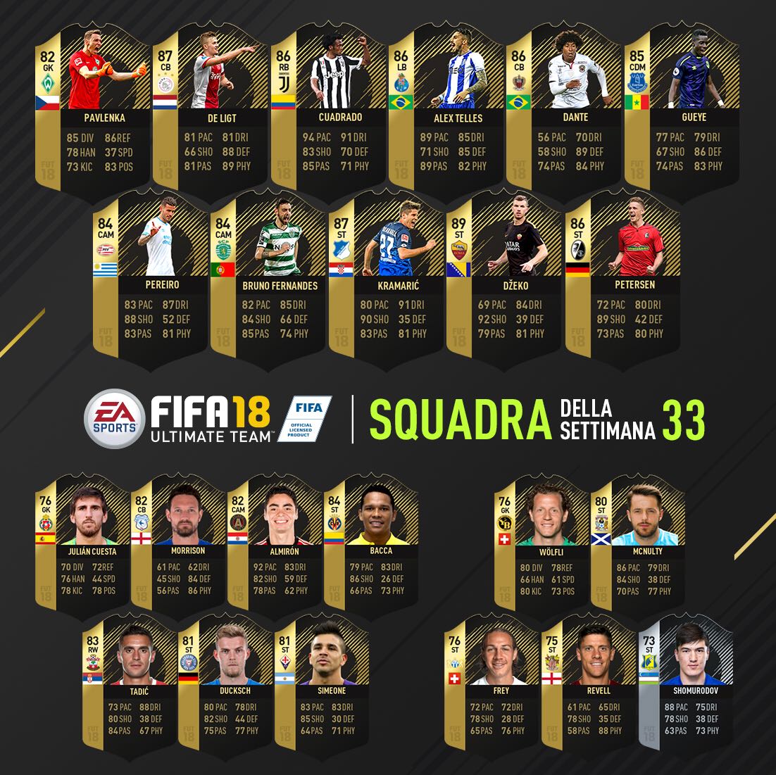 FIFA 18 – Come ogni mercoledì è stato comunicato il nuovo Team Of The Week che dalle 19.00 di oggi sarà disponibile nei pacchetti per Ultimate Team. A guidare la Squadra della Settimana c’è Edin Dzeko, bomber della Roma che ha ricevuto la sua quarta speciale in questa stagione (due IF, due EuropeanManOfTheMatch). Insieme a lui della Serie A c’è Juan Cuadrado versione terzino destro, protagonista con un gol e un assist nel big match di Milano contro l’Inter e che potrebbe diventare la carta più desiderata su FIFA 18 di questo Team Of The Week. A chiudere il trio della Serie A il Cholito Simeone, autore della tripletta decisiva contro il Napoli che può rappresentare un buon investimento per la compravendita nei prossimi giorni.