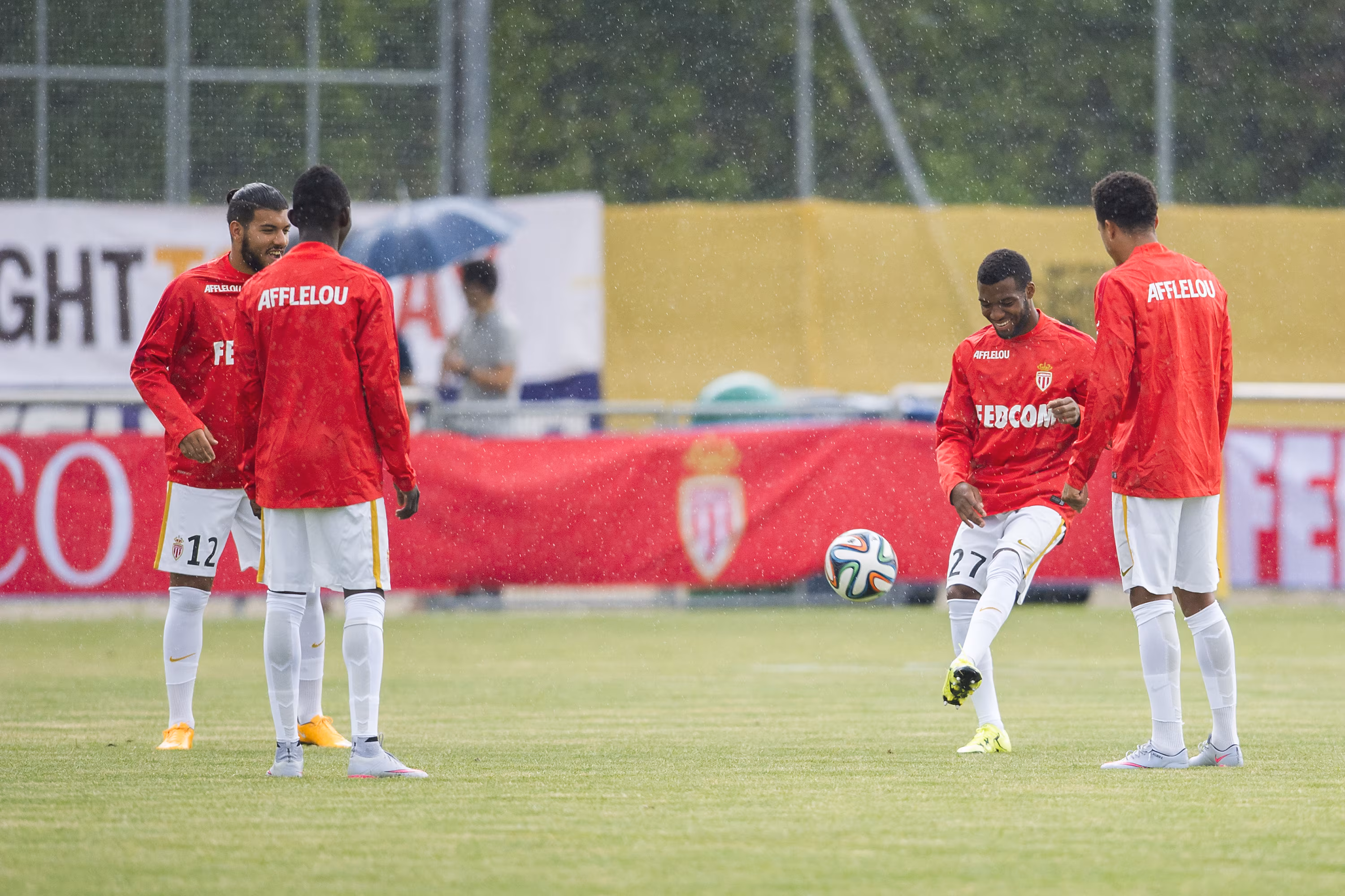 MEYRIN, SWITZERLAND - JULY 22: Thomas Lemar (2nd R) of AS Monaco warms up with his teammates prior to the pre-season friendly match between 1. FSV Mainz 05 and AS Monaco at Stade des Arberes on July 22, 2015 in Meyrin, Switzerland. (Photo by Harold Cunningham/Getty Images)