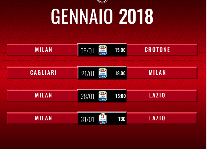 “Chi ben comincia è già a metà dell’opera” è la frase che deve accompagnare il Milan a gennaio 2018. Se iniziare al meglio il nuovo anno è la speranza di tutti, rimontare in campionato e andare avanti al massimo nelle 3 competizioni è un vero obiettivo per i rossoneri.