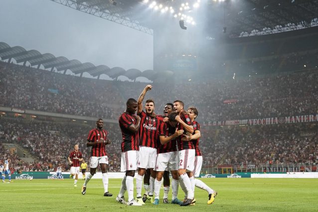 I calciatori del Milan esultano nella splendida cornice di San Siro con oltre 65mila spettatori.