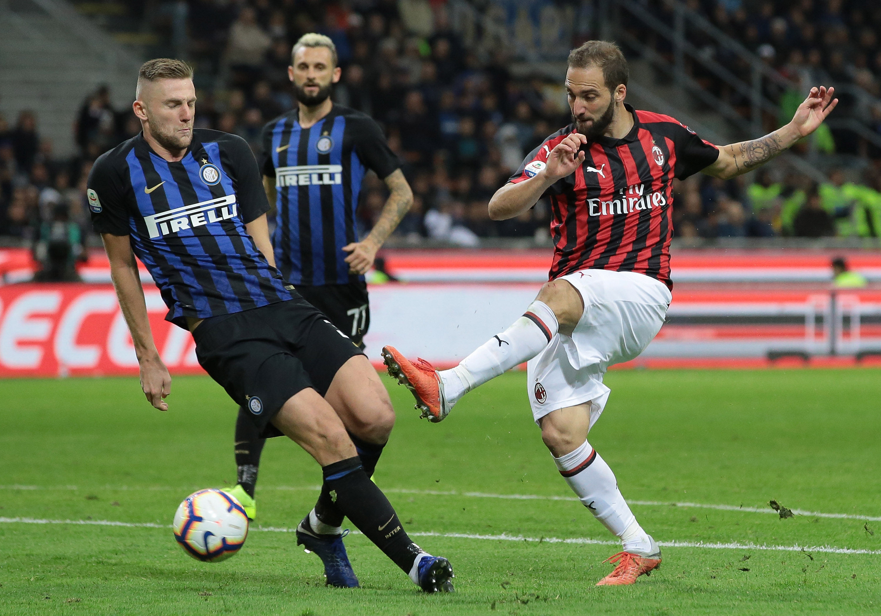 Gonzalo Higuain, bomber del Milan, contrastato da Skriniar dell’Inter.