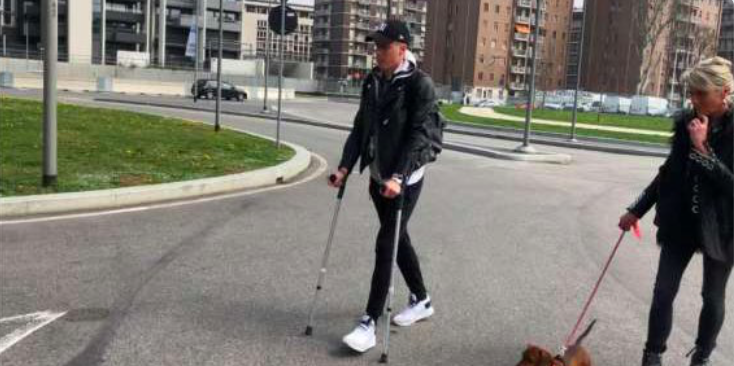 Andrea Conti con le stampelle dopo l'infortunio al ginocchio (Foto via Twitter)