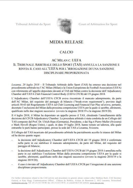 Losanna, 20 luglio 2018 – Il Tribunale Arbitrale dello Sport (TAS) ha emesso una decisione nel procedimento arbitrale tra l’AC Milan (Milan) e la Union Européenne de Football Association (UEFA) con riferimento all’appello depositato davanti al TAS dal Milan contro la decisione dell’Adjudicatory Chamber dell’UEFA Club Financial Control Body (UEFA CFCB) del 19 giugno 2018.