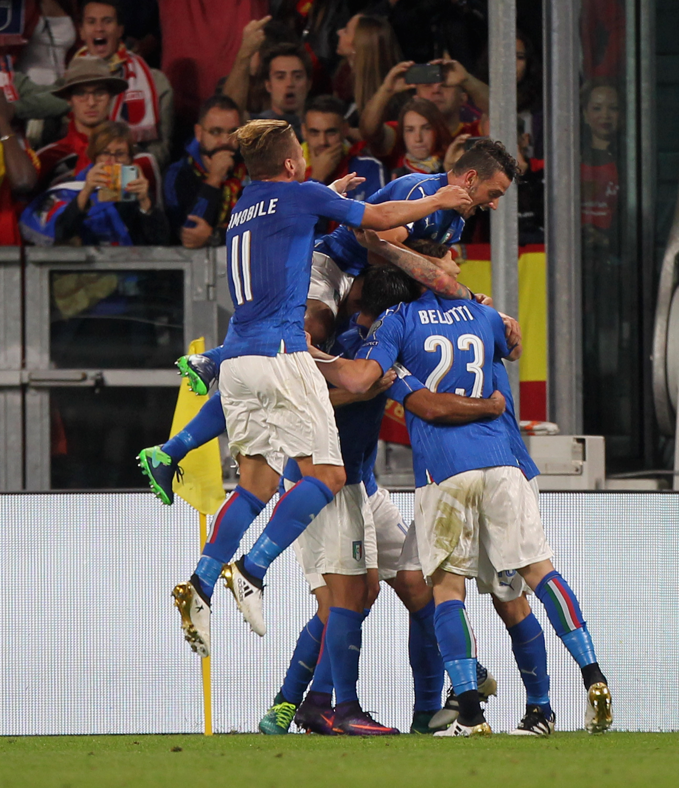 TURIN, ITALY - OCTOBER 06: Daniele De Rossi (C) with his teammates of Italy celebrates after scoring the team's first goal from penalty spot during the FIFA 2018 World Cup Qualifier between Italy and Spain at Juventus Stadium on October 6, 2016 in Turin, Italy. (Photo by Paolo Bruno/Getty Images)