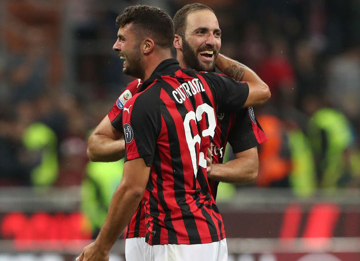 Higuain e Cutrone esultano insieme dopo il goal del Milan alla Roma.