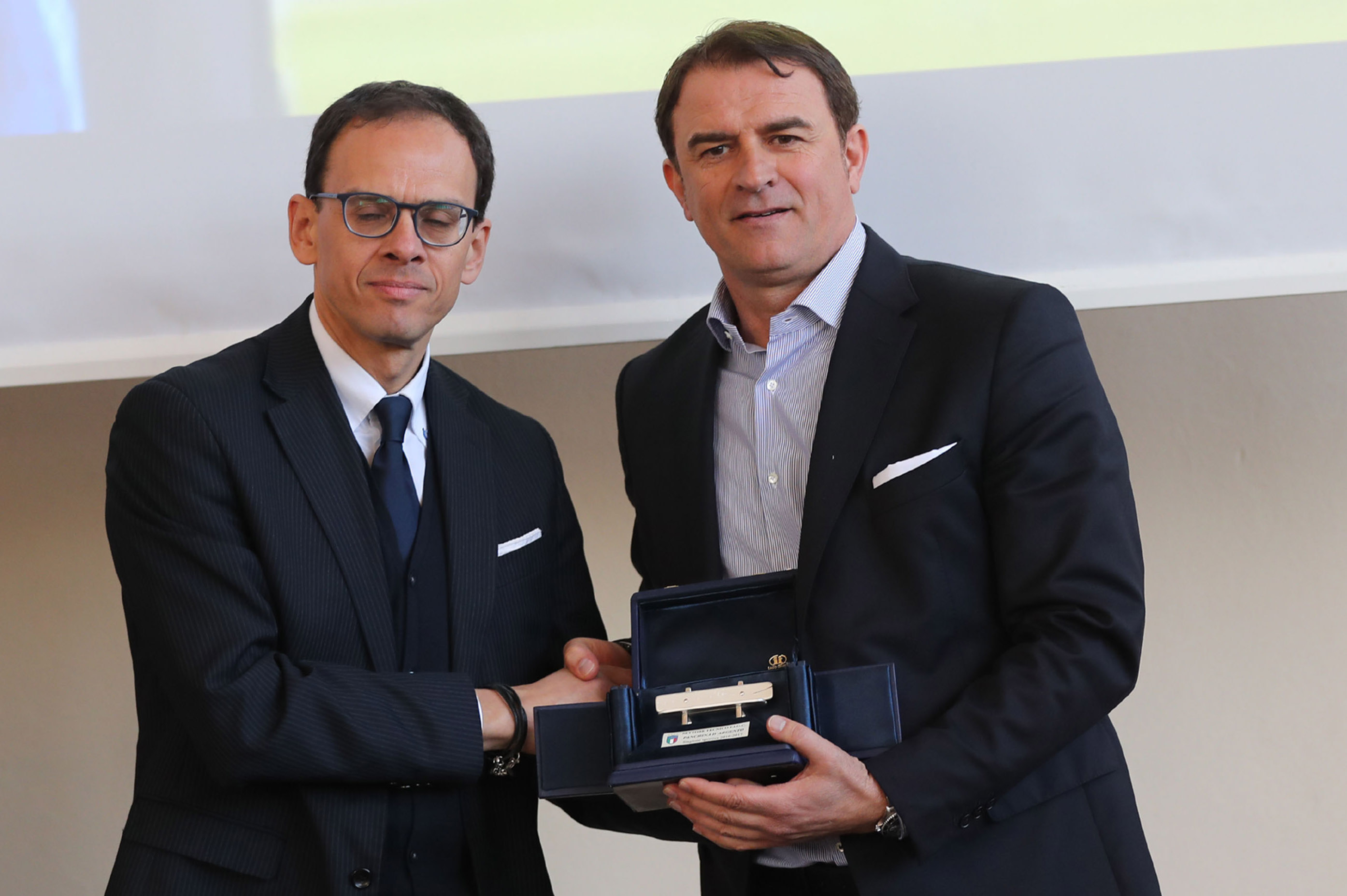 FLORENCE, ITALY - MARCH 26: Leonardo Semplici manager of SPAL receives the "Silver Bench" award during the Italian Football Federation 'Panchine D'Oro E D'Argento' Prize at Coverciano on March 26, 2018 in Florence, Italy. (Photo by Gabriele Maltinti/Getty Images)