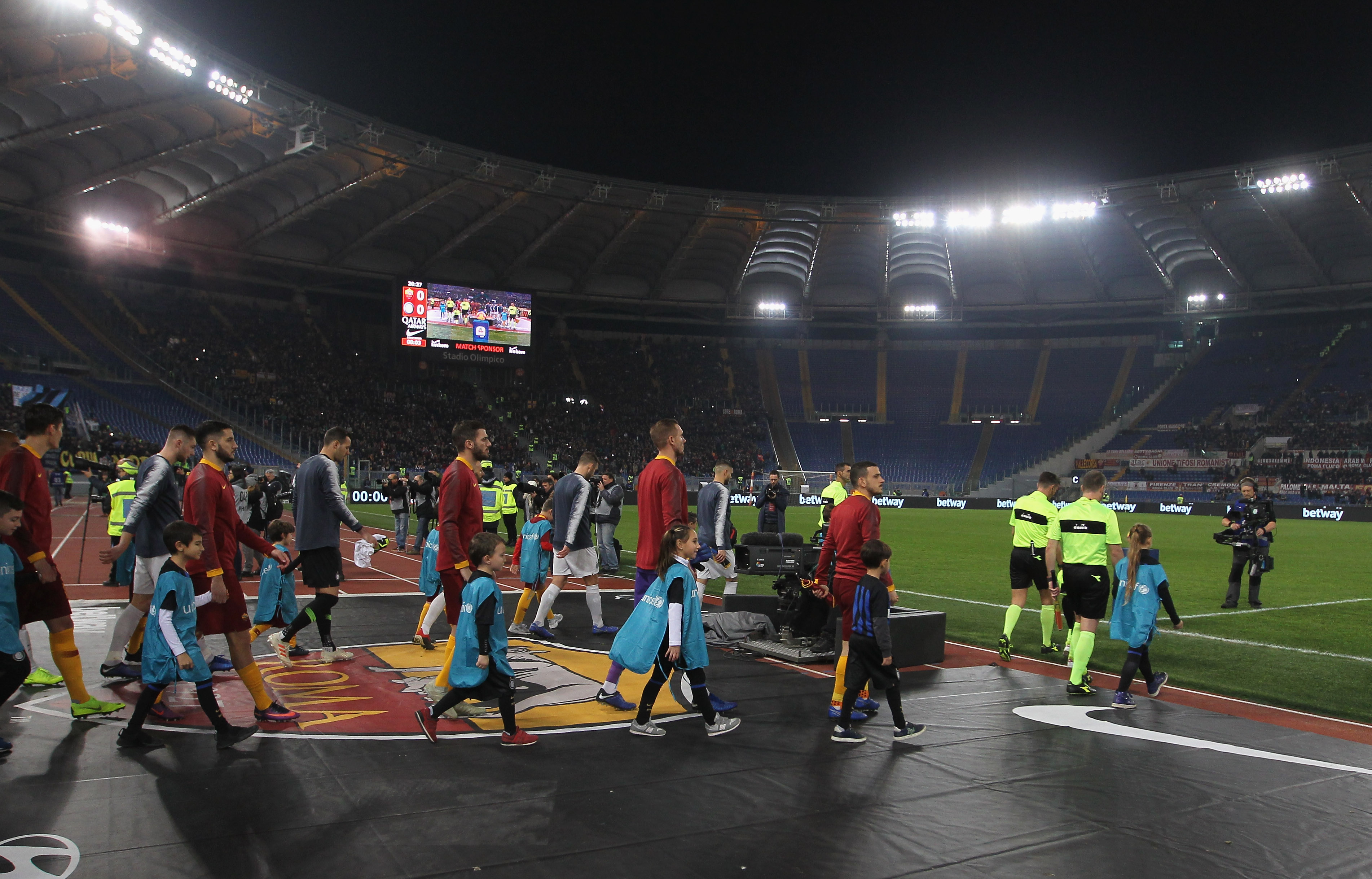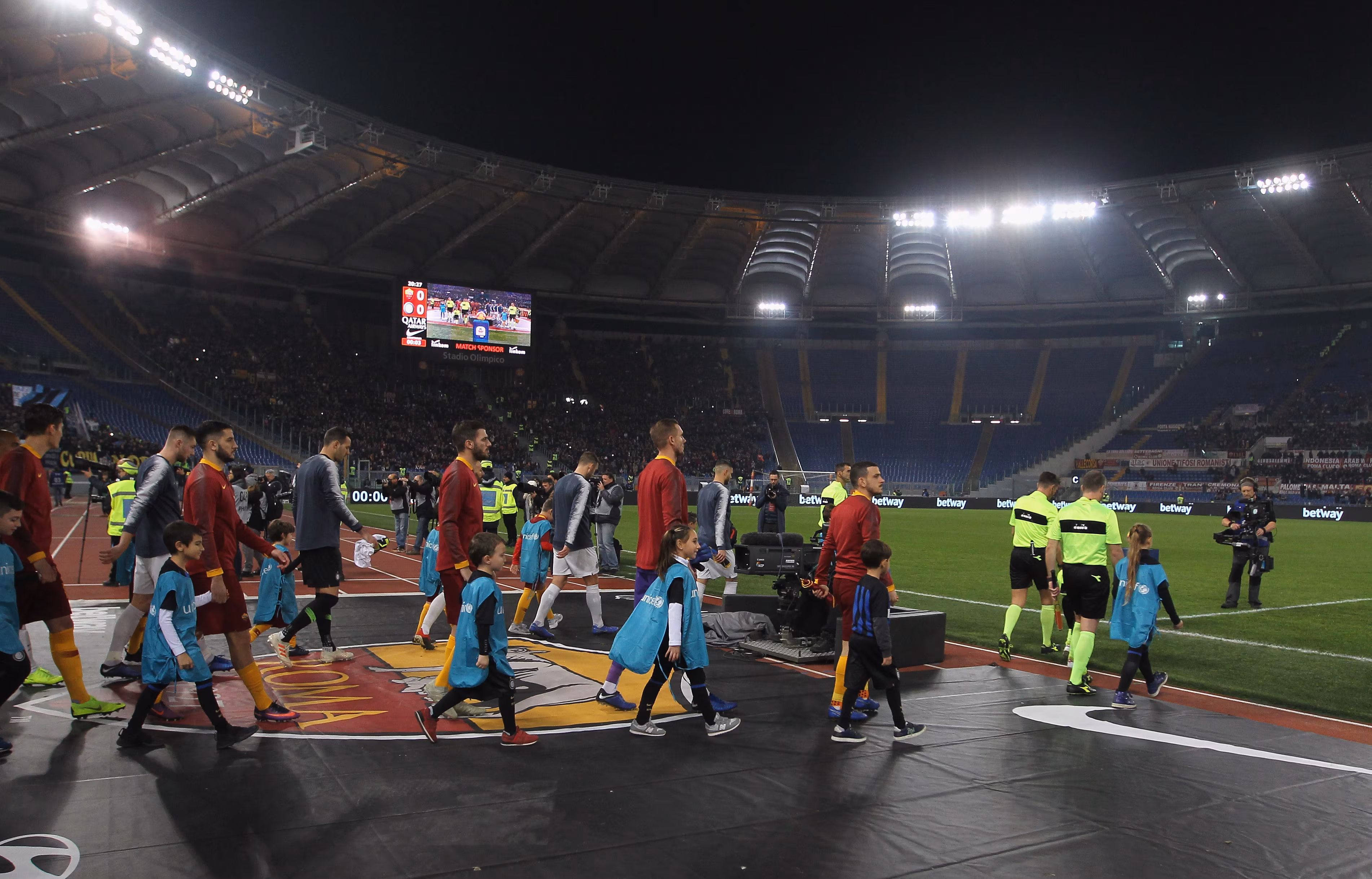 ROME, ITALY - DECEMBER 02: AS Roma and FC Internazionale players enter on the pitch during the Serie A match between AS Roma and FC Internazionale at Stadio Olimpico on December 2, 2018 in Rome, Italy. (Photo by Paolo Bruno/Getty Images)