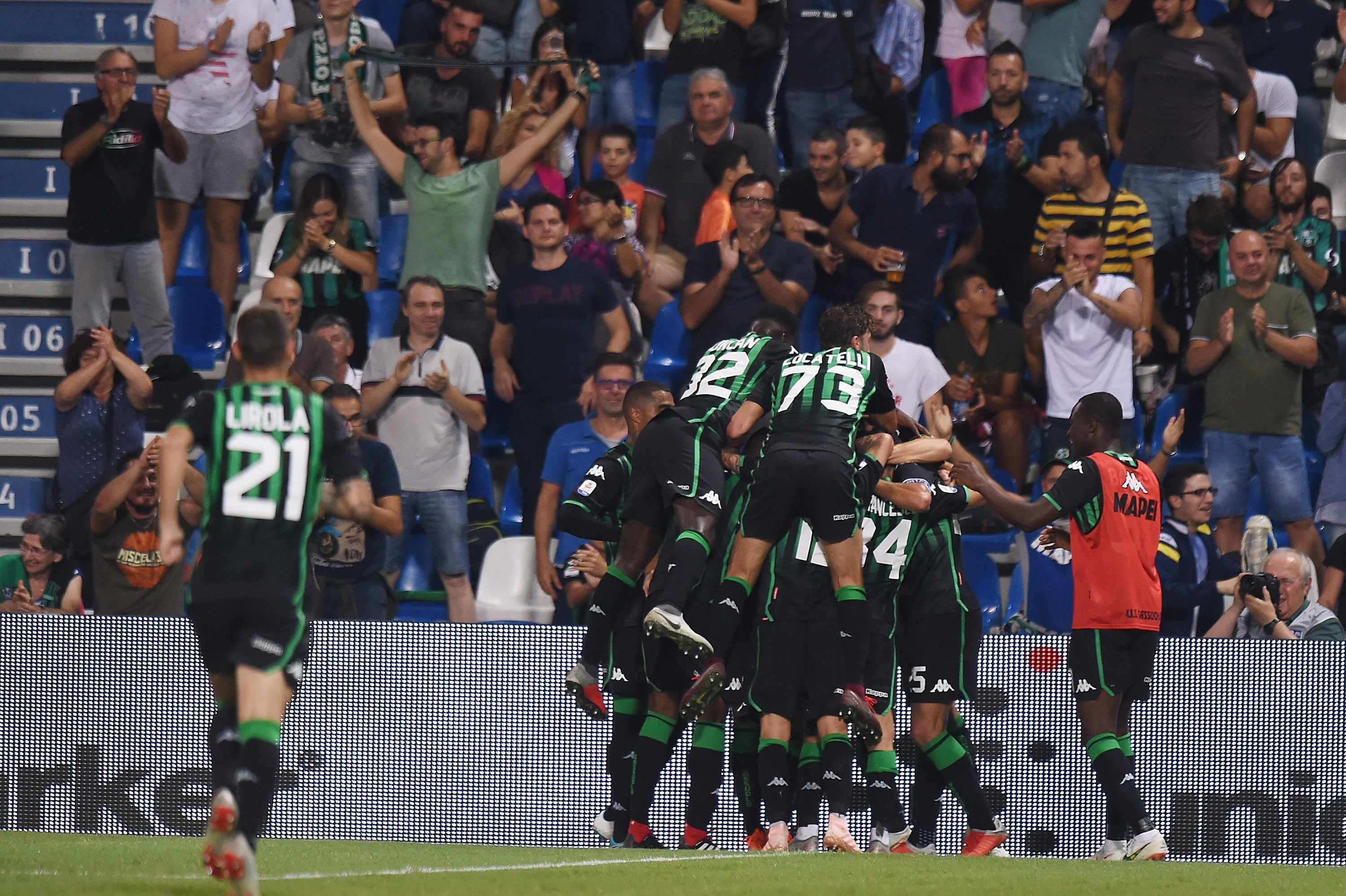 Il Sassuolo festeggia un goal sotto i propri tifosi al "Mapei Stadium".