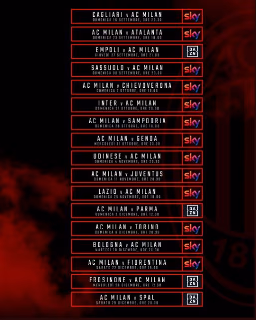 MILANO – La Serie A di questa stagione è trasmessa in parte su Sky e in parte su DAZN. Il profilo del Milan ha dunque post di riepilogo con tutte le partite dei rossoneri e su quale piattaforma saranno trasmesse. Ecco il post: