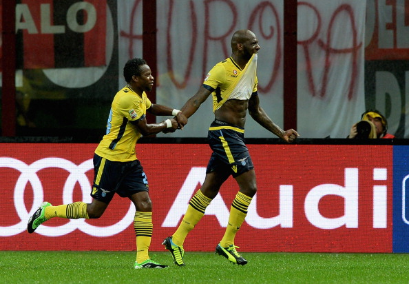 MILAN, ITALY - OCTOBER 30: Mickael Ciani of SS Lazio (R) celebrates scoring the first goal during the Serie A match between AC Milan and SS Lazio at San Siro Stadium on October 30, 2013 in Milan, Italy. (Photo by Claudio Villa/Getty Images)