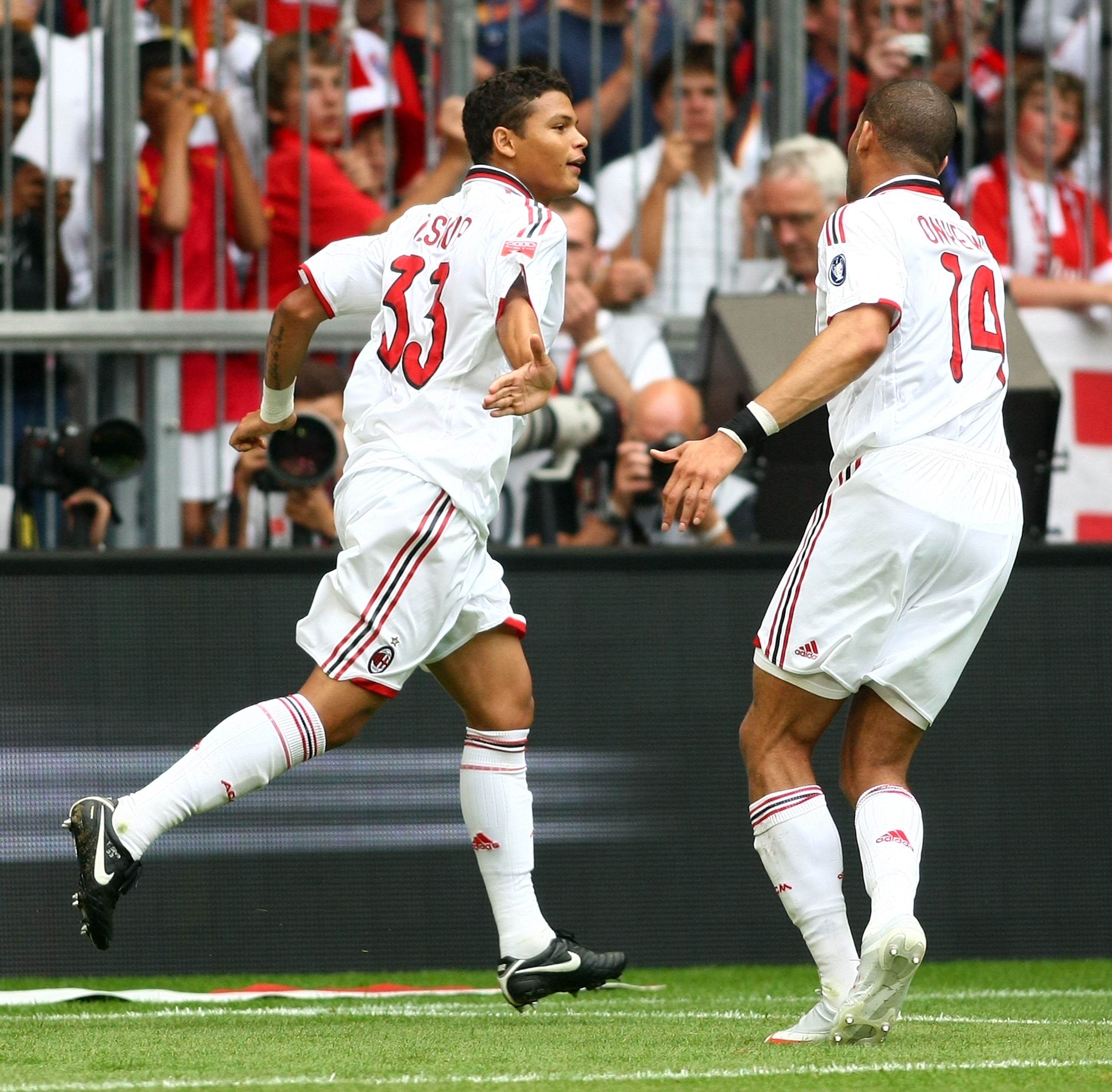 MUNICH, GERMANY - JULY 30: Thiago Silva (L) of Milan celebrates with teammate Oguchi Onyewu after scoring 1-0 during the Audi Cup tournament final match for the third place Boca Juniors v AC Milan at Allianz Arena on July 30, 2009 in Munich, Germany. (Photo by Johannes Simon/Bongarts/Getty Images)