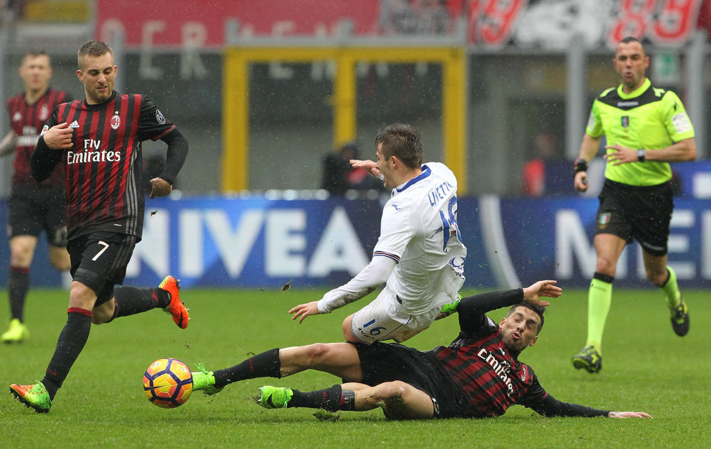 MILAN, ITALY - FEBRUARY 05: Karol Linetty of UC Sampdoria is challenged by Jose Sosa (down) of AC Milan during the Serie A match between AC Milan and UC Sampdoria at Stadio Giuseppe Meazza on February 5, 2017 in Milan, Italy. (Photo by Marco Luzzani/Getty Images)