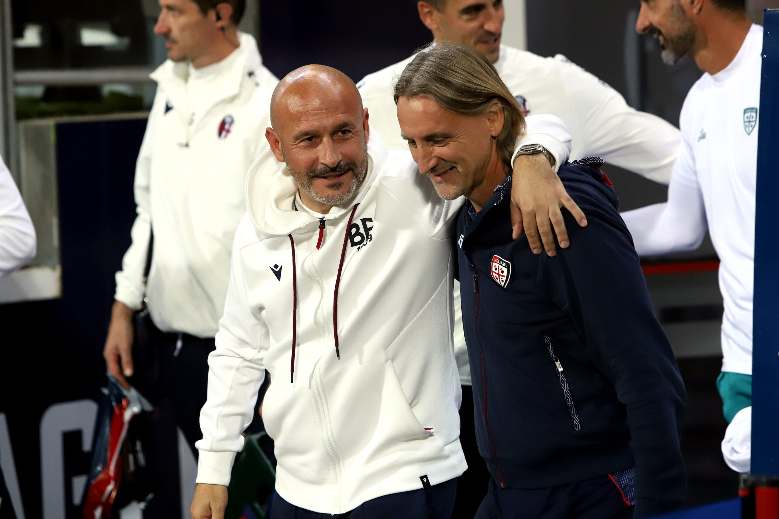 CAGLIARI, ITALY - OCTOBER 29: Davide Nicola coach of Cagliari and Vincenzo Italiano coach of Bologna during the Serie A match between Cagliari and Bologna at Sardegna Arena on October 29, 2024 in Cagliari, Italy. (Photo by Enrico Locci/Getty Images)