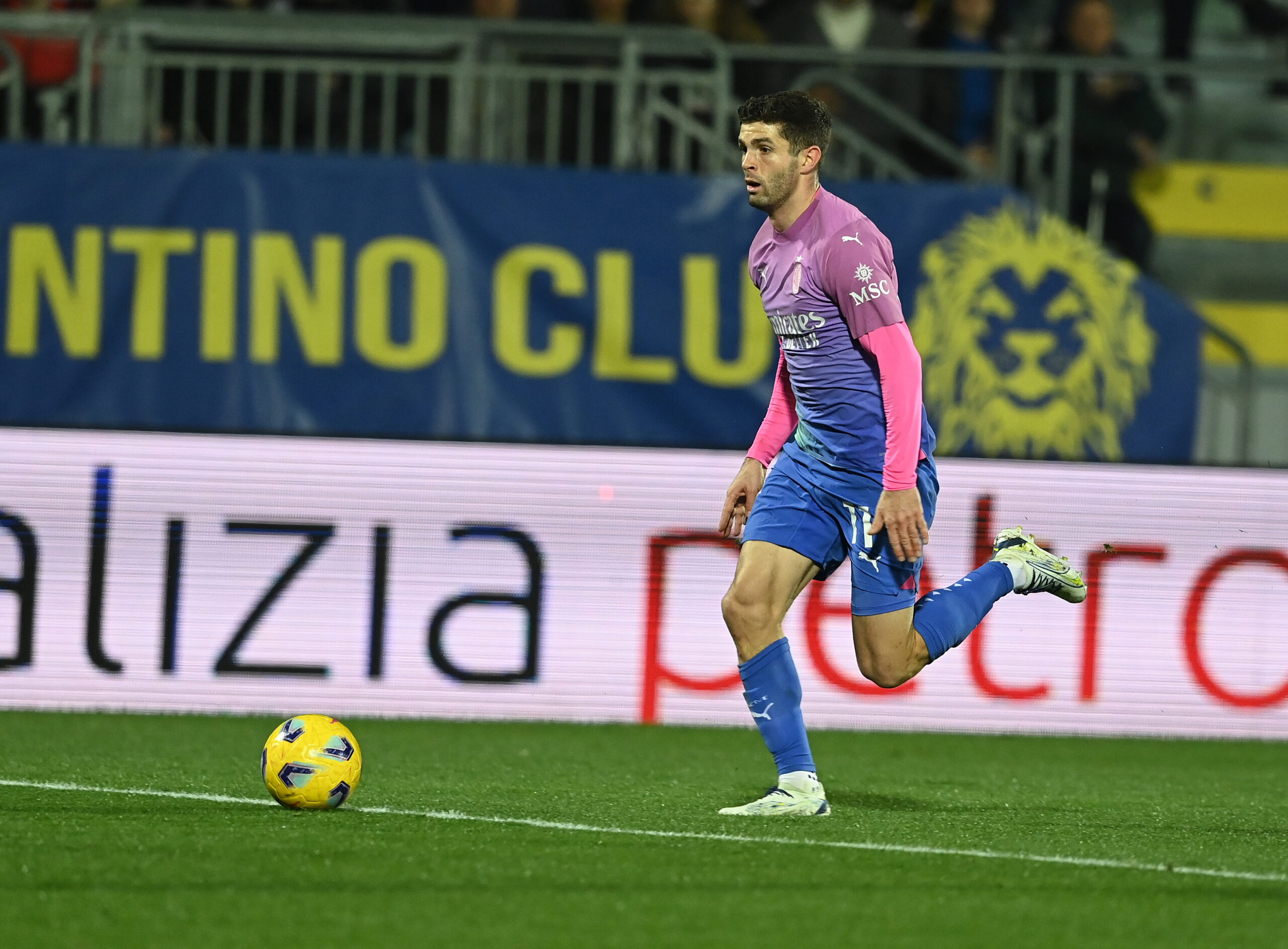 FROSINONE, ITALY - FEBRUARY 03: Christian Pulisic of AC Milan in action during the Serie A TIM match between Frosinone Calcio and AC Milan at Stadio Benito Stirpe on February 03, 2024 in Frosinone, Italy. (Photo by Claudio Villa/AC Milan via Getty Images)