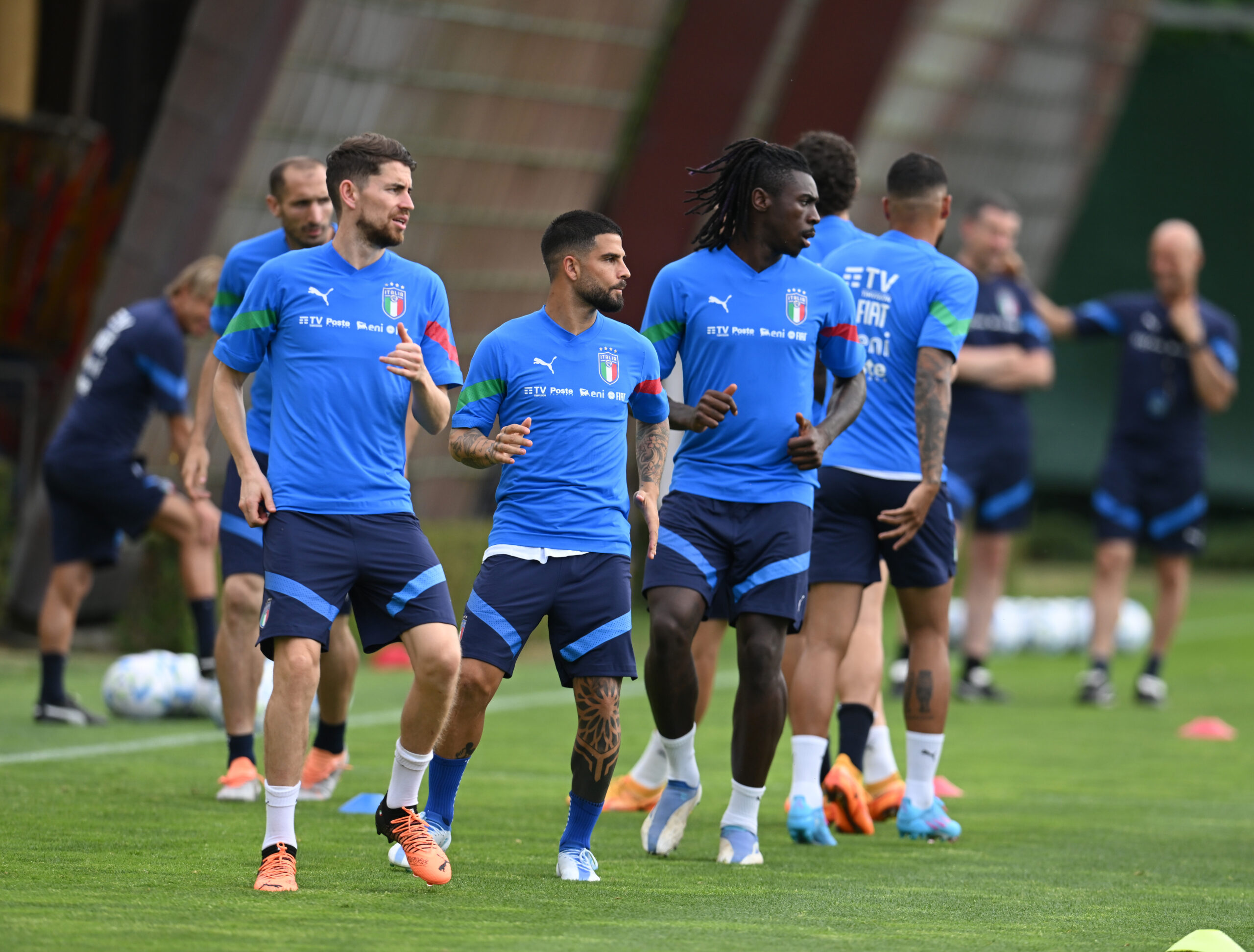 FLORENCE, ITALY - MAY 27: Jorginho, Lorenzo Insigne and Moise Kean of Italy in action during training session at Centro Tecnico Federale di Coverciano on May 27, 2022 in Florence, Italy. (Photo by Claudio Villa/Getty Images)