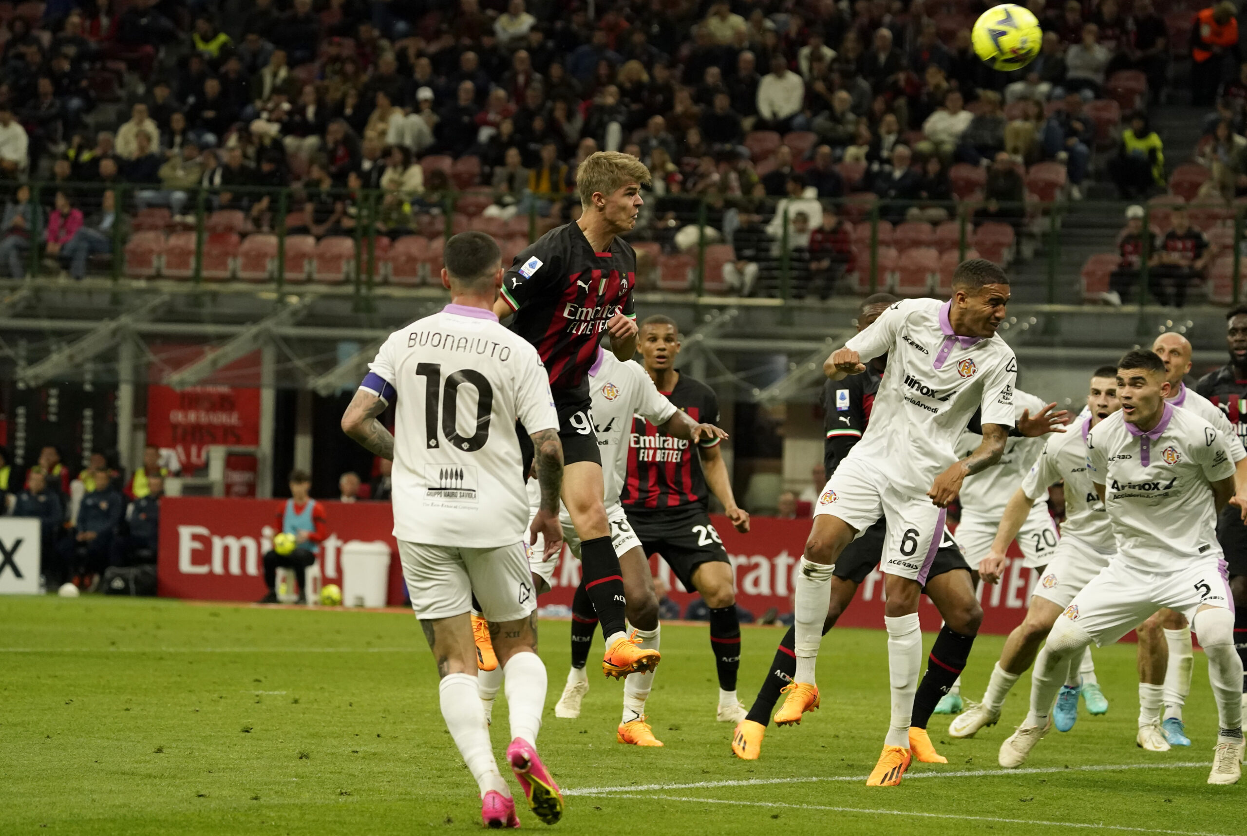 MILAN, ITALY - MAY 03: Charles De Ketelaere of AC Milan jumps for the ball during the Serie A match between AC Milan and US Cremonese at Stadio Giuseppe Meazza on May 03, 2023 in Milan, Italy. (Photo by Pier Marco Tacca/AC Milan via Getty Images)