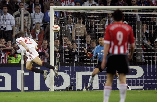 EINDHOVEN, NETHERLANDS - MAY 4: Massimo Ambrosini of Milan scores the goal that took his team to the final during the champions league semi final second Leg match between PSV Eindhoven and AC Mailand at the Philips Stadium on May 4, 2005 in Eindhoven, Netherlands. (Photo by Lars Baron/Bongarts/Getty Images)