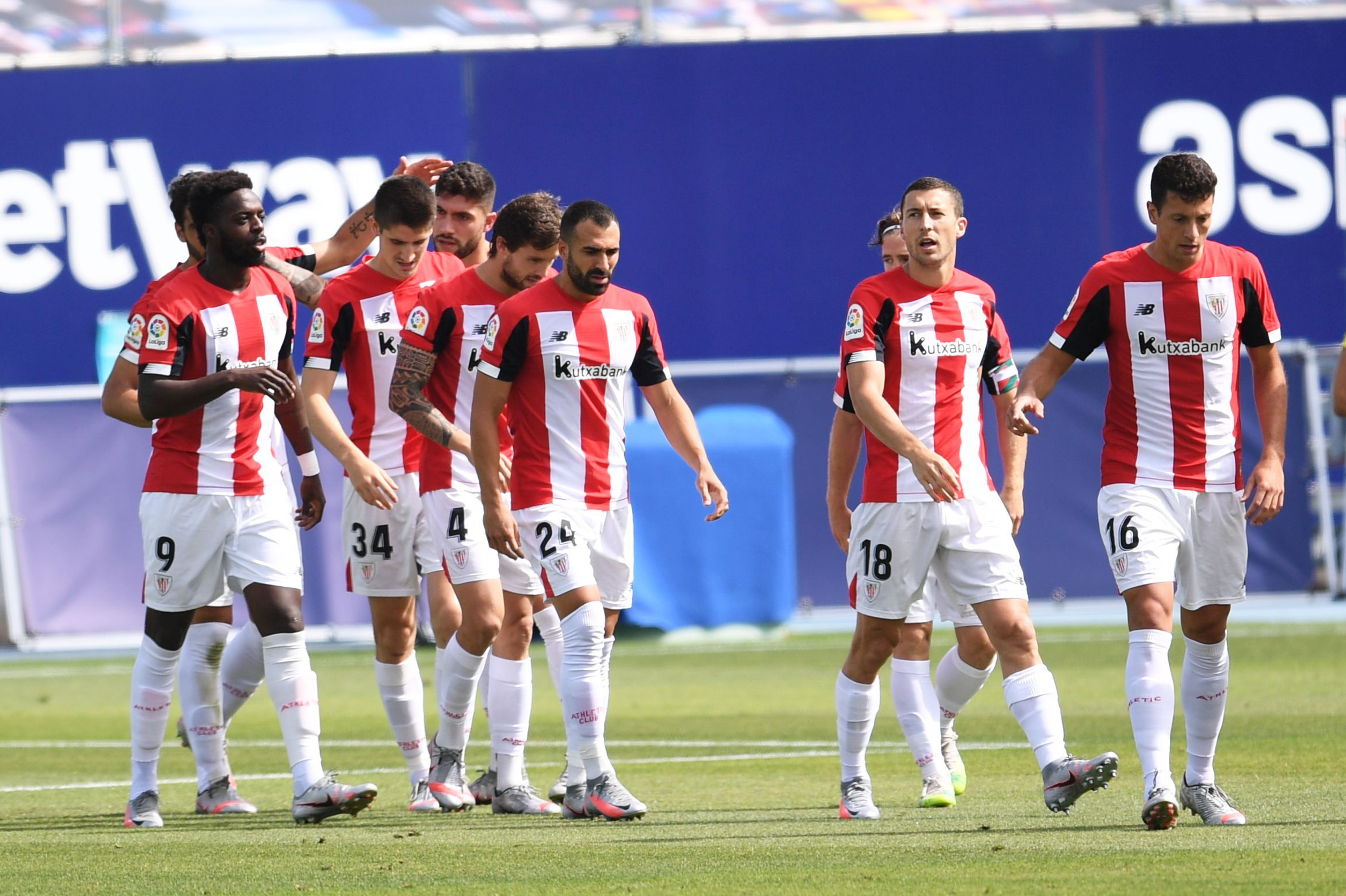 LA NUCIA, SPAIN - JULY 12: Raul Garcia of Athletic Bilbao (hidden) celebrates with teammates after scoring his team's first goal during the Liga match between Levante UD and Athletic Club at Estadi Olimpic Camilo Cano on July 12, 2020 in La Nucia, Spain. Football Stadiums around Europe remain empty due to the Coronavirus Pandemic as Government social distancing laws prohibit fans inside venues resulting in all fixtures being played behind closed doors. (Photo by David Ramos/Getty Images)