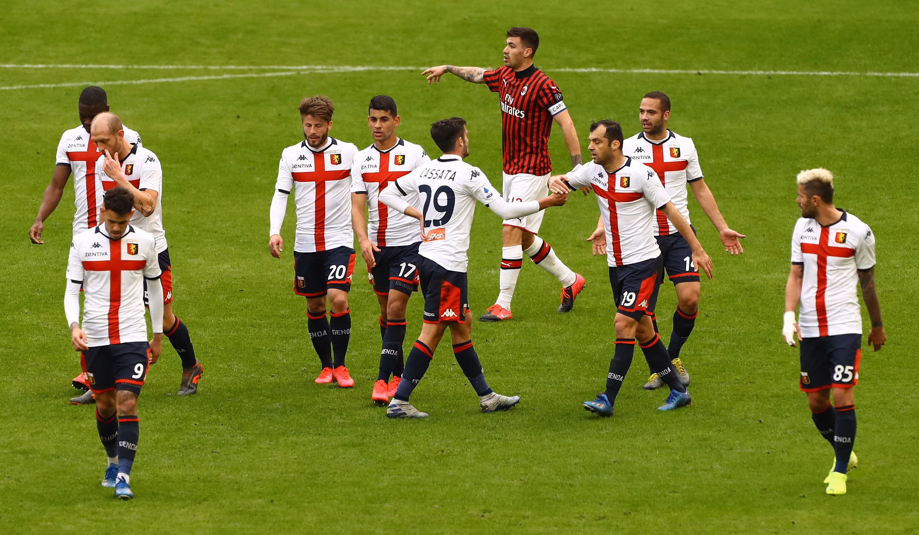 Alessio Romagnoli, capitano del Milan, chiede il fuorigioco di Pandev dopo il raddoppio del Genoa.