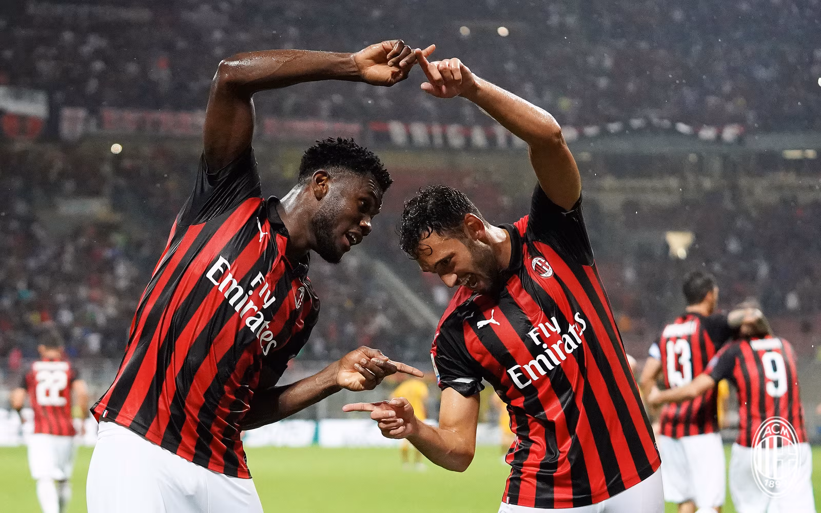 Kessie festeggia con Hakan Calhanoglu la sua prima rete stagionale contro la Roma.