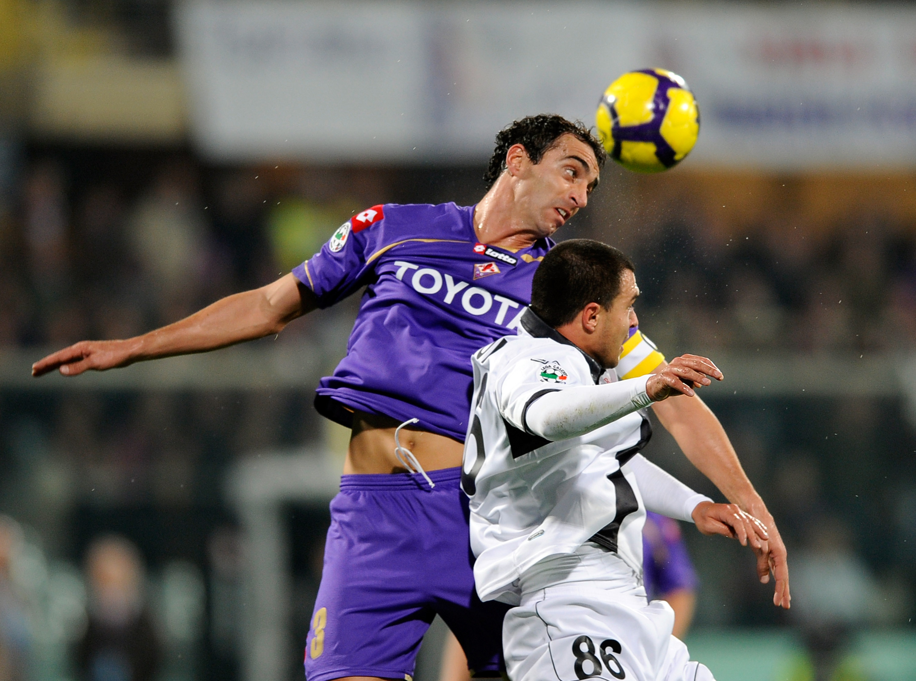 FLORENCE, ITALY - NOVEMBER 21: Dario Dainelli of ACF Fiorentina competes for the ball with Valeri Bojinov of Parma FC during the Serie A match between Fiorentina and Parma at Stadio Artemio Franchi on November 21, 2009 in Florence, Italy. (Photo by Claudio Villa/Getty Images)