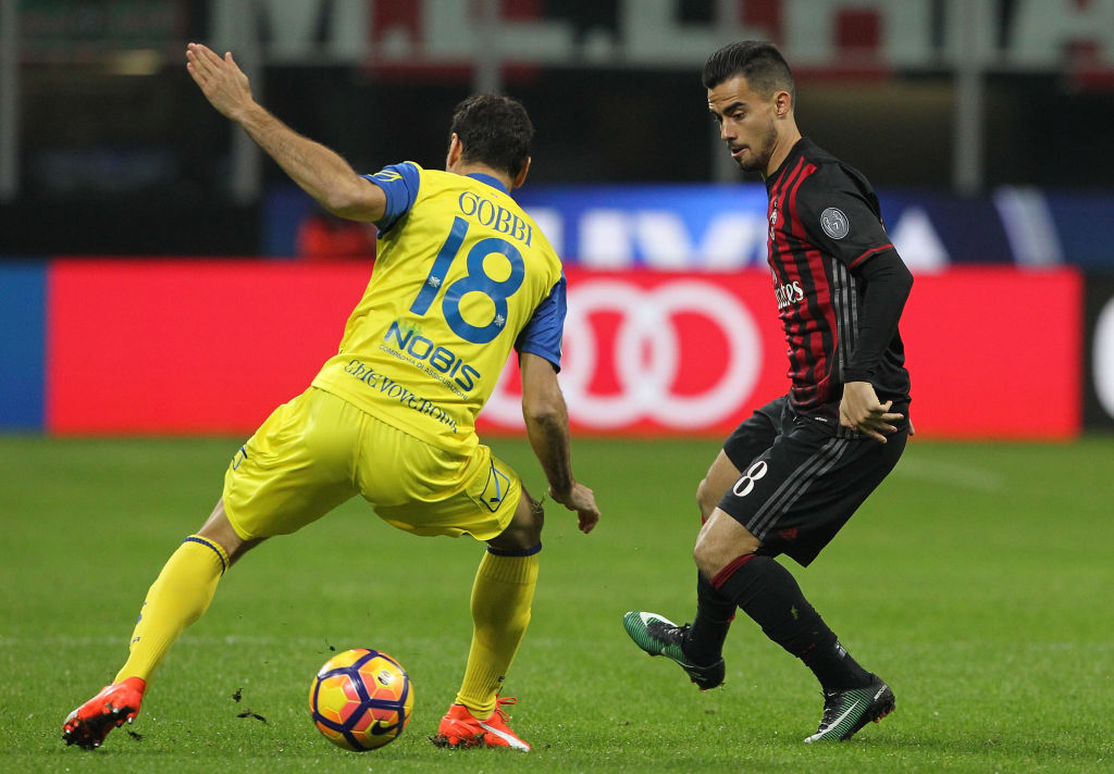MILAN, ITALY - MARCH 04: Fernandez Suso (R) of AC Milan is challenged by Massimo Gobbi (L) of AC ChievoVerona during the Serie A match between AC Milan and AC ChievoVerona at Stadio Giuseppe Meazza on March 4, 2017 in Milan, Italy. (Photo by Marco Luzzani/Getty Images)