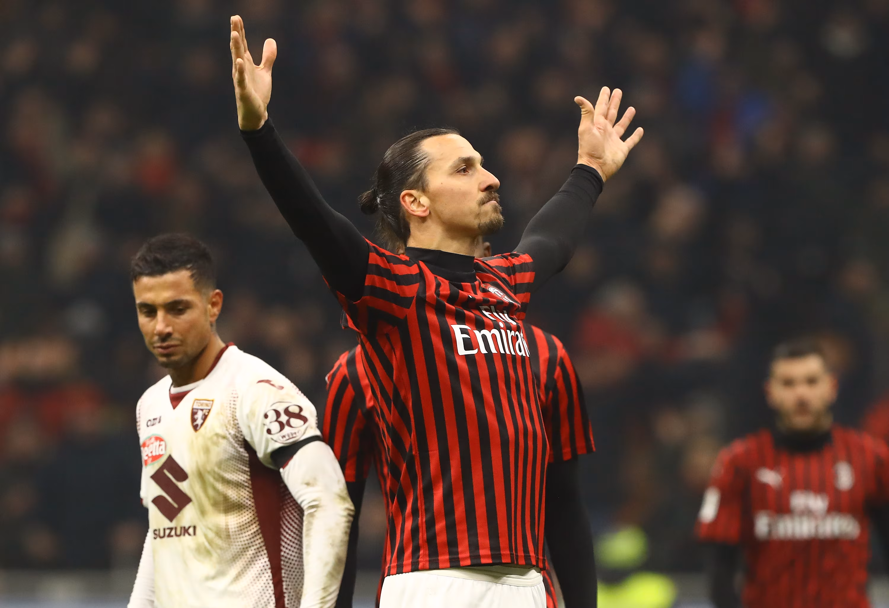 Zlatan Ibrahimovic, 38enne attaccante del Milan, esulta a San Siro dopo il goal al Torino.