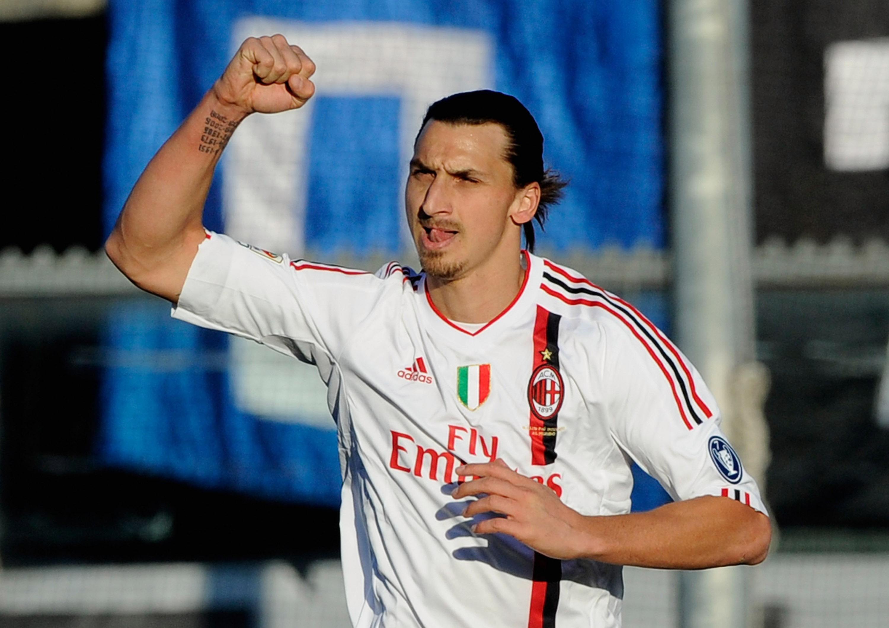Zlatan Ibrahimovic, nel 2012 con la maglia del Milan, festeggia il vantaggio da lui segnato contro l'Atalanta.