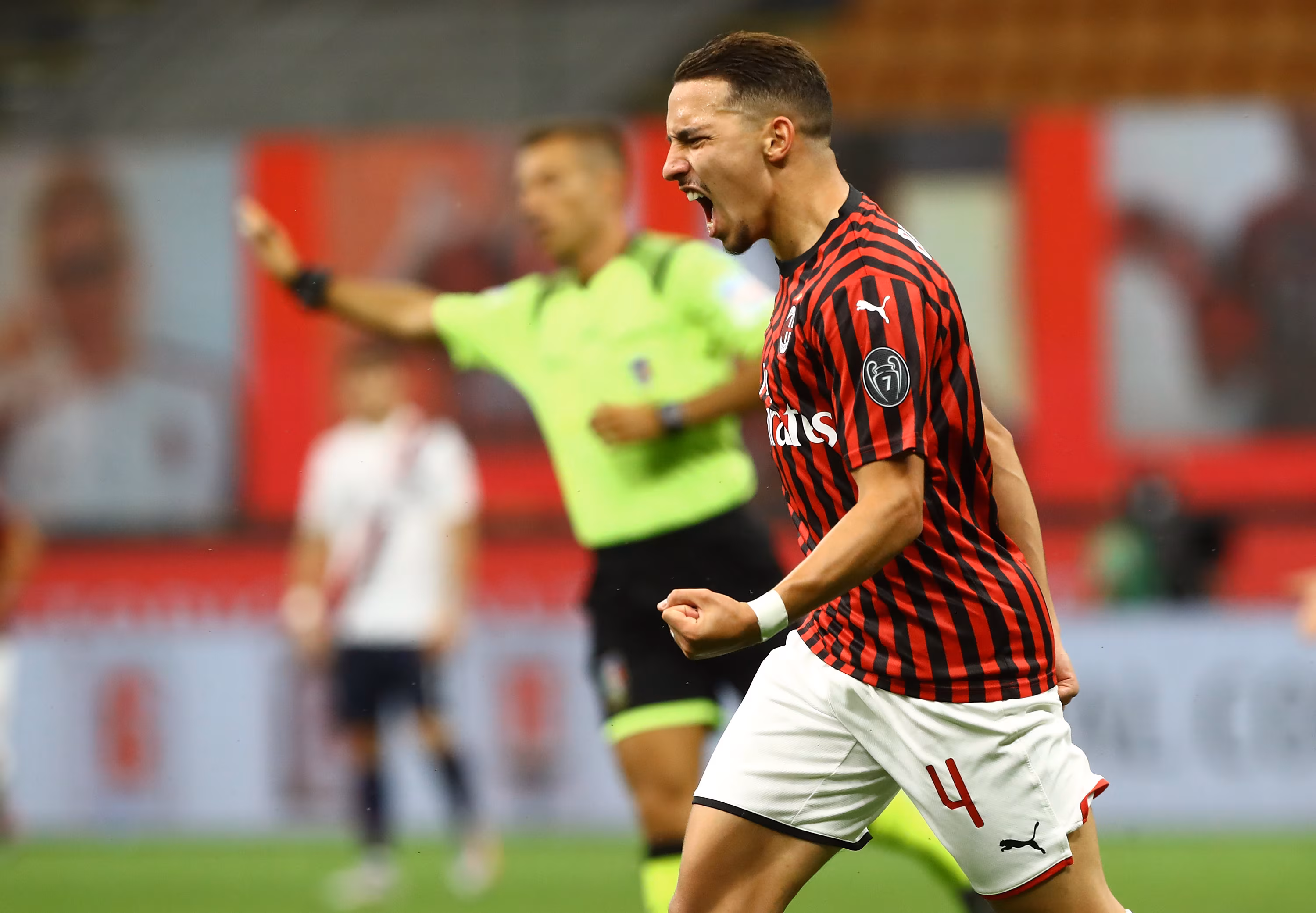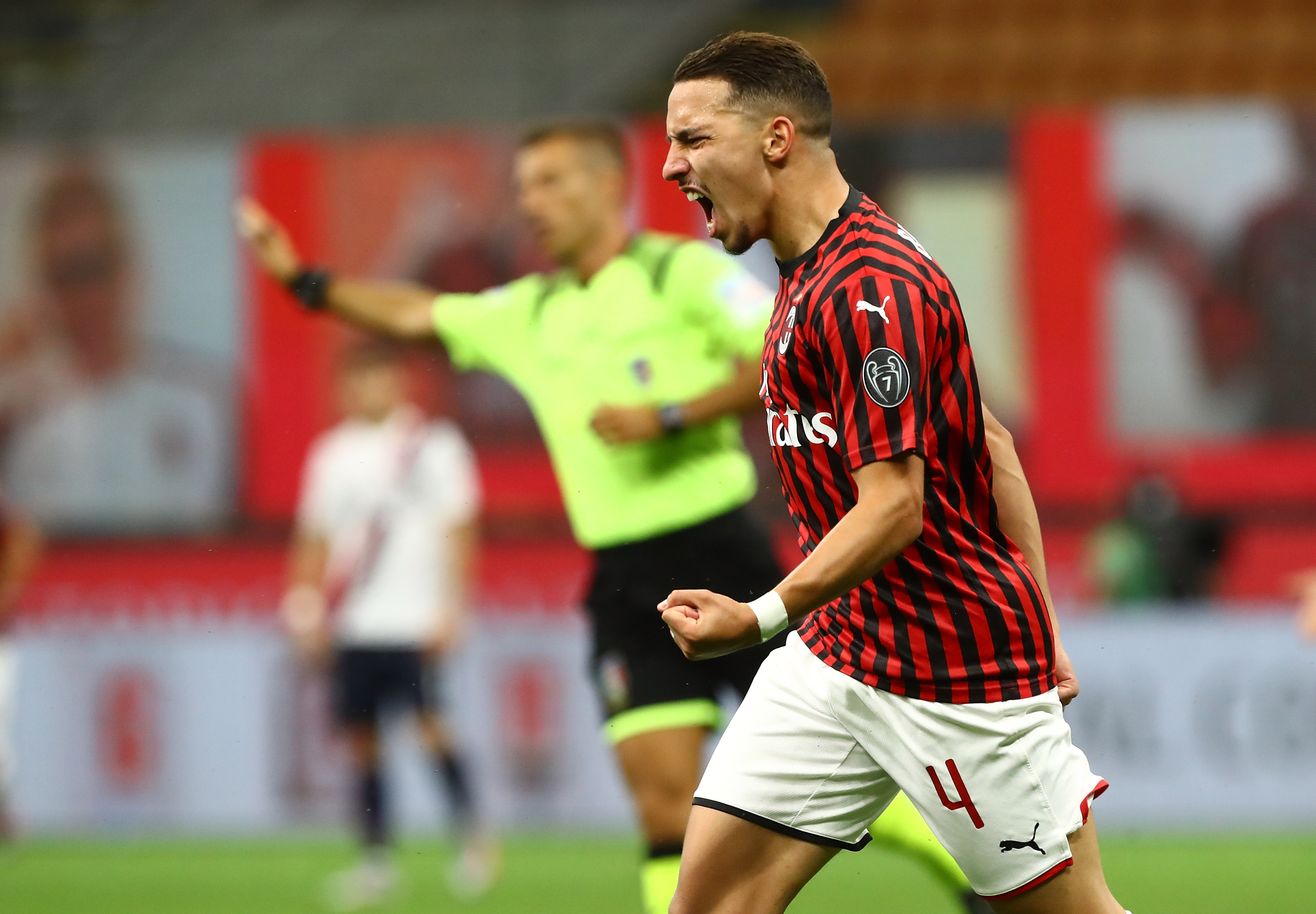MILAN, ITALY - JULY 18: Ismael Bennacer of AC Milan celebrates his goal during the Serie A match between AC Milan and Bologna FC at Stadio Giuseppe Meazza on July 18, 2020 in Milan, Italy. (Photo by Marco Luzzani/Getty Images)
