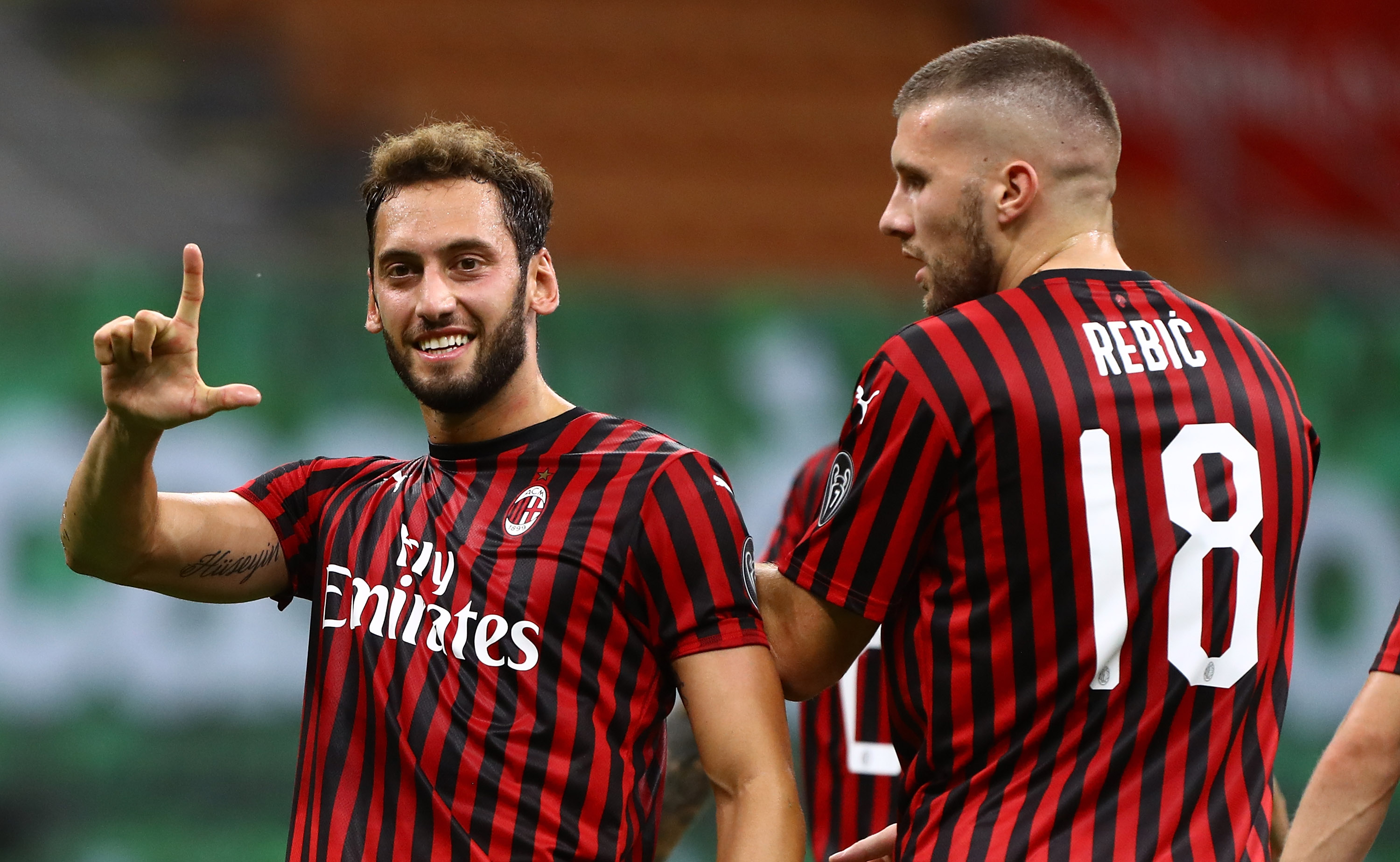 MILAN, ITALY - JULY 18: Hakan Calhanoglu of AC Milan celebrates after scoring the second goal of his team during the Serie A match between AC Milan and Bologna FC at Stadio Giuseppe Meazza on July 18, 2020 in Milan, Italy. (Photo by Marco Luzzani/Getty Images)
