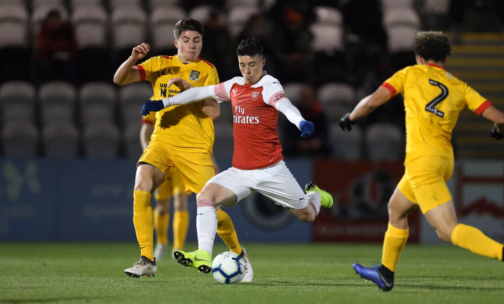 BOREHAMWOOD, ENGLAND - DECEMBER 12: Sam Greenwood of Arsenal U18 attempts a shot at goal during the FA Youth Cup 3rd Round match between Arsenal U18 and Northampton Town U18 at Meadow Park on December 12, 2018 in Borehamwood, England. (Photo by Pete Norton/Getty Images)