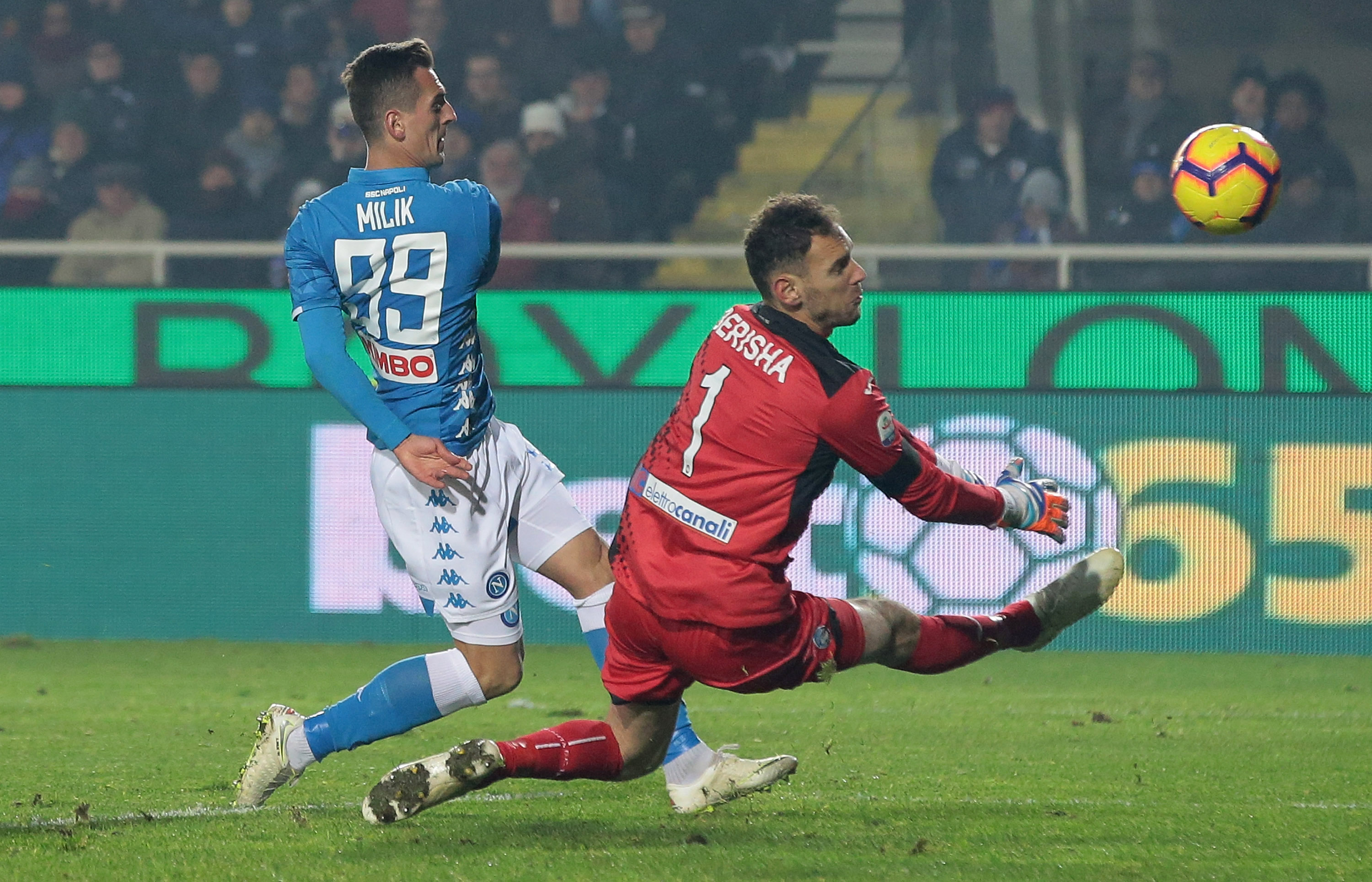 BERGAMO, ITALY - DECEMBER 03: Arkadiusz Milik of SSC Napoli scores his goal during the Serie A match between Atalanta BC and SSC Napoli at Stadio Atleti Azzurri d'Italia on December 3, 2018 in Bergamo, Italy. (Photo by Emilio Andreoli/Getty Images)