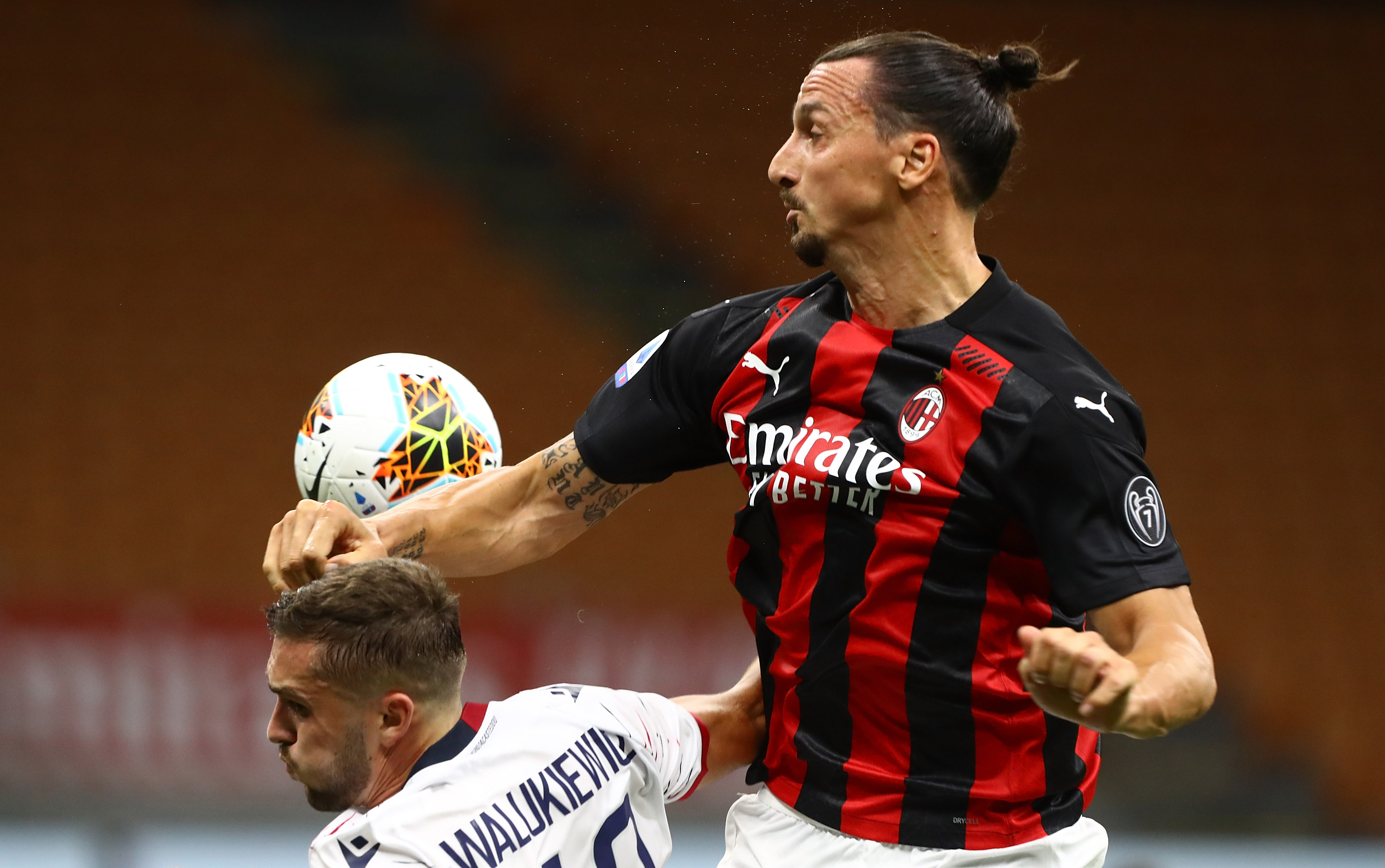 MILAN, ITALY - AUGUST 01: Zlatan Ibrahimovic (R) of AC Milan competes for the ball with Sebastian Walukiewicz of Cagliari Calcio during the Serie A match between AC Milan and Cagliari Calcio at Stadio Giuseppe Meazza on August 01, 2020 in Milan, Italy. (Photo by Marco Luzzani/Getty Images)